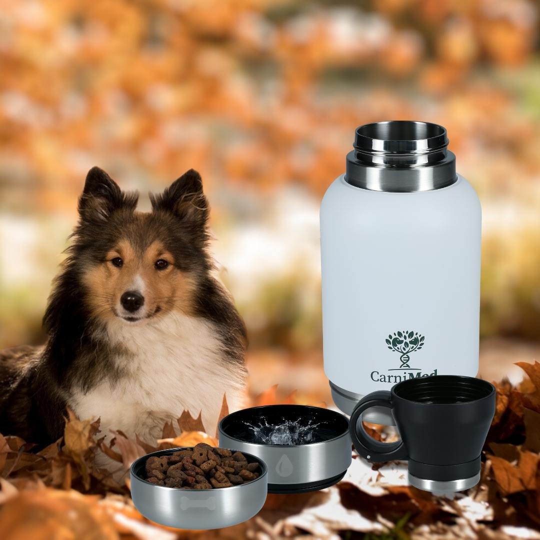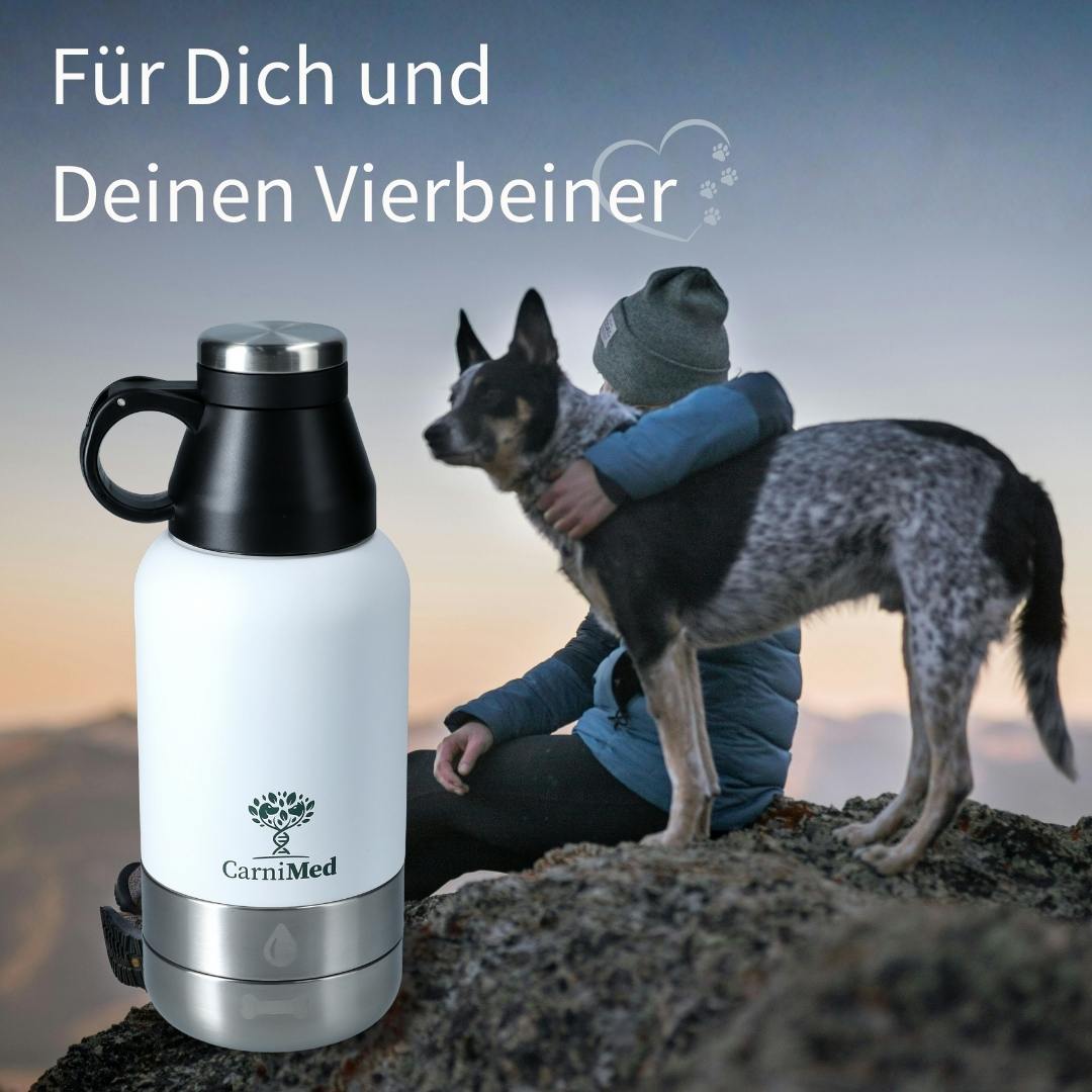 Die CarniMed Thermo-Trinkflasche aus Edelstahl ist der perfekte Begleiter für Spaziergänge, Wanderungen und Reisen. Sie vereint Trinkflasche, Wasserschale, Futterschale und Tasse in einem – ideal für unterwegs mit deinem Hund.