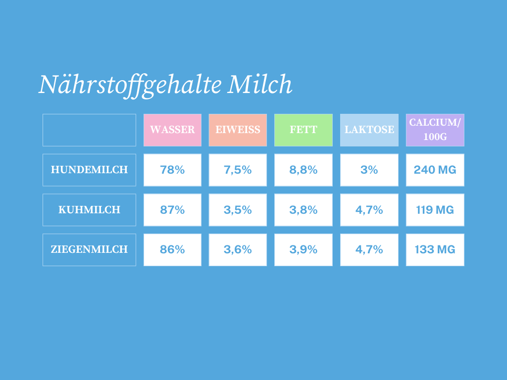 Diese Milch ist speziell auf die Bedürfnisse der Welpen abgestimmt und unterscheidet sich in ihrer Zusammensetzung deutlich von Kuh- oder Ziegenmilch. Besonders der Fettgehalt in der Muttermilch ist beachtlich. Mit 8,8 % Fett liefert sie nicht nur Energie, sondern auch wichtige Bausteine für das Wachstum von Gehirn und Nervensystem.