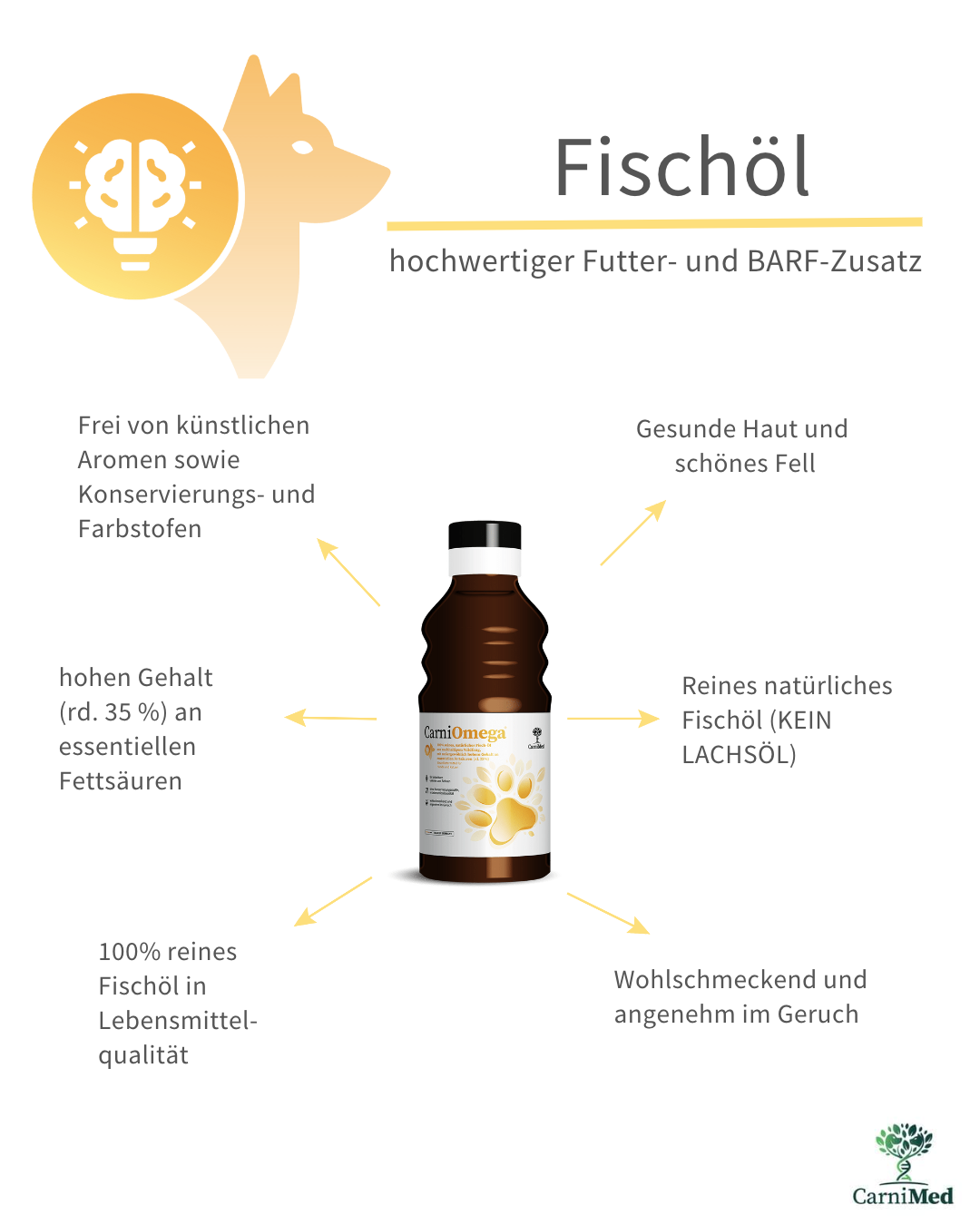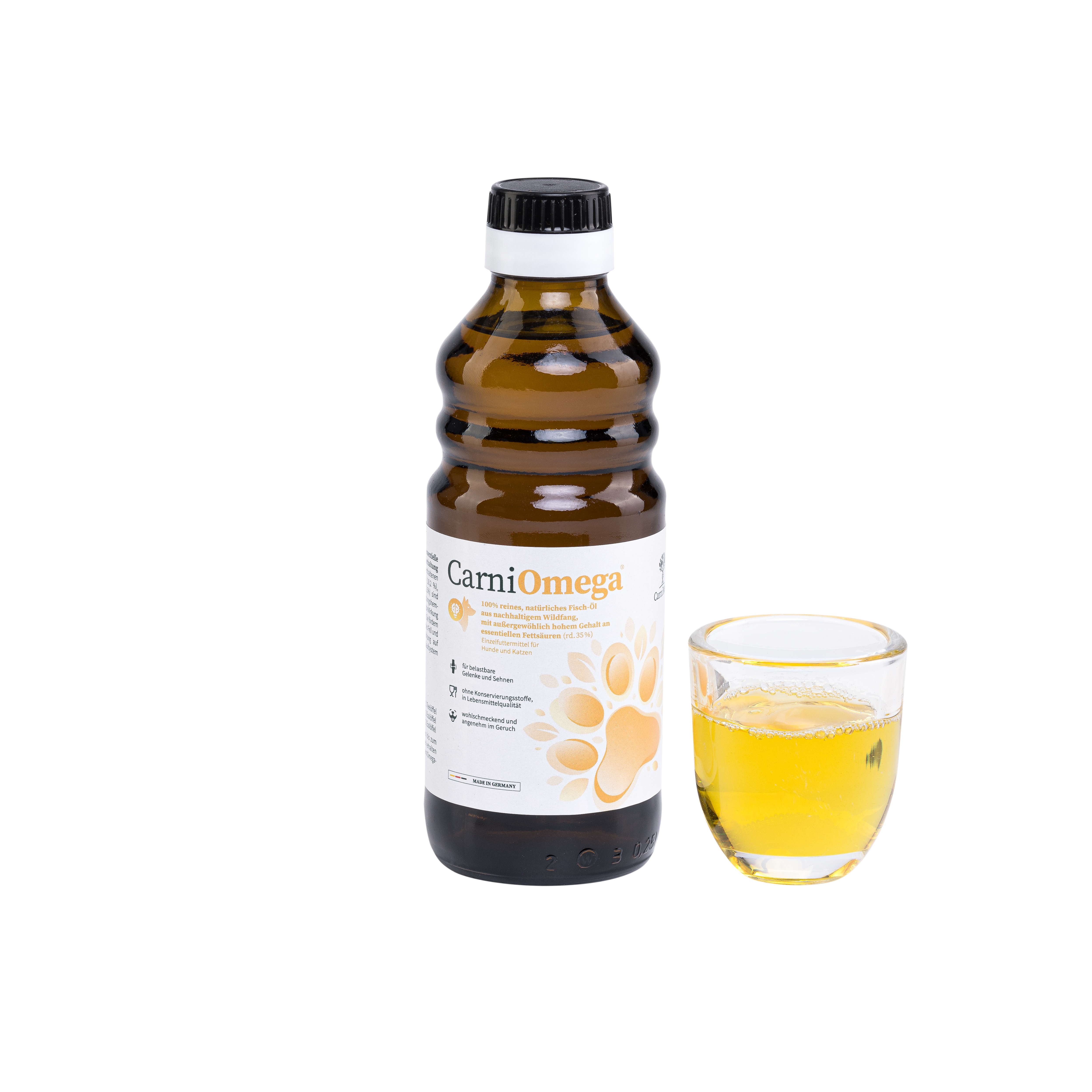 Pure natural fish oil as a high-quality feed and barf supplement for your dog. With an exceptionally high content (approx. 35 %) of essential fatty acids.
